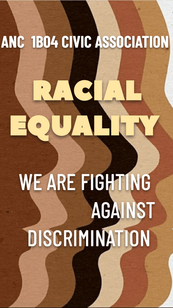 ANC 1B04 Civic Association Members work hard together to eliminate racial disparities in our city. We proactively develop ways to address and achieve racial equity in the District of Columbia. We also believe the government plays a critical role in acknowledging the root causes of existing disparities and we want to help the government to put in place innovative and courageous policies to confront them.